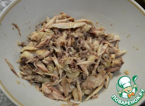 Кости выбрасываем в любом случае, а кожу можете использовать. Я мясо не стала никак измельчать, мне нравится кусочками. А если мясо прокрутить вместе с кожей, то холодец получится более тугой. -