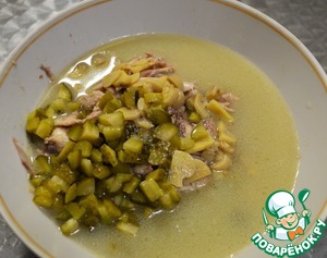 вопрос по рецептуНаташ, меня немного сбивает слово "маринады" в 5-ом шаге: "В миску с мясом выкладываем наши маринады и процеживаем туда же бульон...", ты имеешь в виду только нарезанные маринованные грибы и огурчики или еще и маринад добавляешь? В инграх, вроде, их нет...