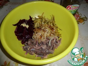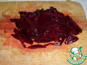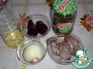 • Подготавливаем продукты. Отвариваем до готовности свеклу, остужаем и очищаем. Отвариваем в подсоленной воде куриные желудки до готовности и остужаем.