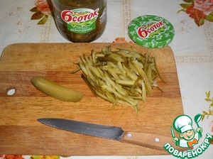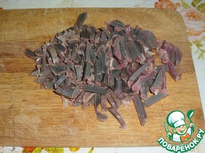 • Пока обжаривается лук, нарезаем соломкой отваренные куриные желудки.