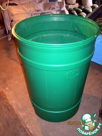 Складываем мытые арбузы в бочку и заливаем тузлуком. Сверху гнёт с грузом и в холодное место на 45 дней.
