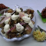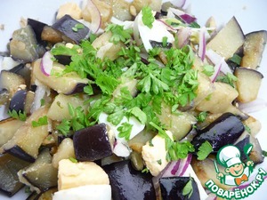 Переложить обжаренные баклажаны в миску или салатник без масла, в котором они жарились. Оставить баклажаны остывать. Добавить отжатый от маринада лук, нарезанное кубиками яйцо, каперсы. Аккуратно перемешать.