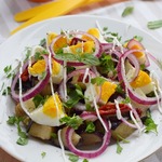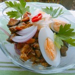 Предлагаю приготовить вкусный и простой салат из баклажана, вареного яица и маринованного лука. Маринованный лук приятно похрустывает, мягкие баклажаны тают во рту, салат очень гармоничный, ароматный.