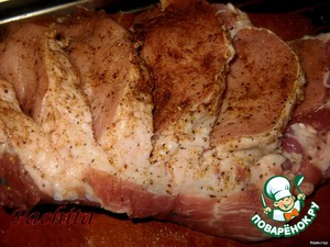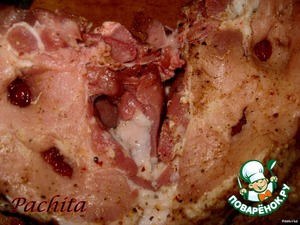 Делаем в каждом кусочке надрезы, шпигуем вяленой вишней.