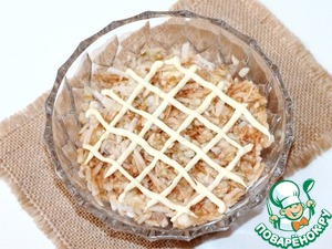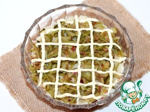4. Выкладываем салат слоями: первый слой - курица + яблоко. Смазать майонезом.