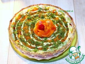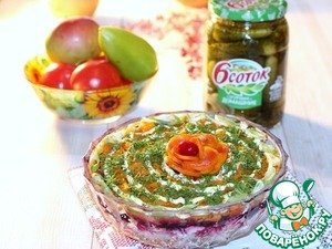 6. Следующий слой - свекла + морковь. Можно немного подсолить и поперчить. Сверху смазать салат майонезом, посыпать измельченным укропом, зеленым луком и поместить в холодильник минут на 30.