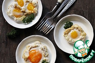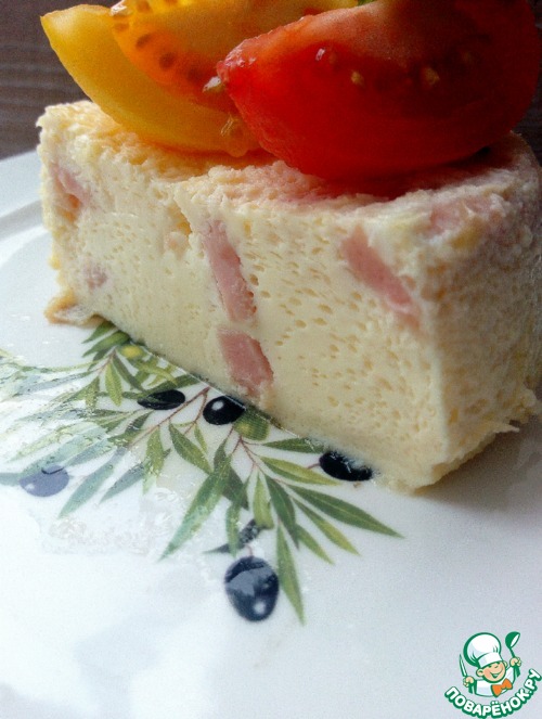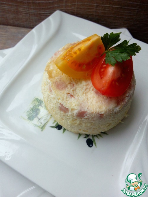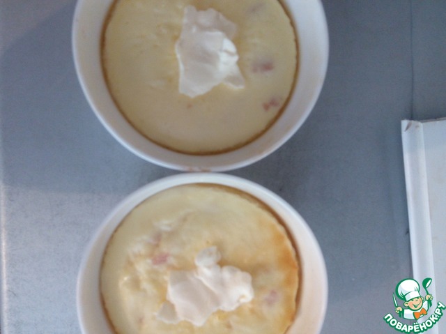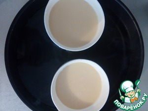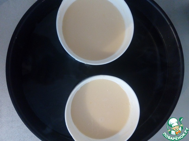 Формы смазываем сливочным маслом. Разливаем нашу заготовку для омлета по формочкам. У меня хватило ровно на 2 формы. Ставим их в другую форму большего размера. В большую форму наливаем воды так, чтобы она доходила ровно до половины маленьких формочек. Отправляем в духовку и запекаем 30 минут.