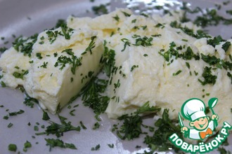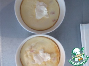 За 5 минут до готовности вынимаем наши формы из духовки. Ескость с водой убираем, она нам больше не понадобиться. На готовый омлет выкладываем по кусочку масла и отправляем еше на 5 минут в духовку.