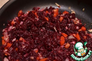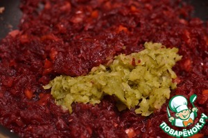 Свеклу натереть на средней терке, добавить к луку с перцем, огуречный рассол (он придаст свекле пикантности и выполняет роль стабилизатора цвета) и тушить 30 минут, помешивая.