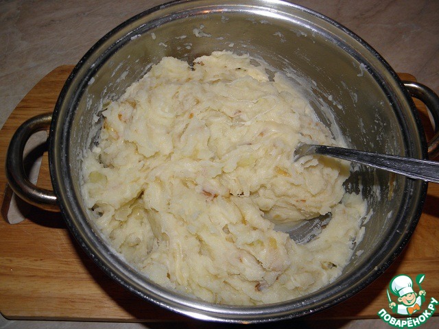 • С готового картофеля сливаем воду, разминаем в пюре со сливочным маслом