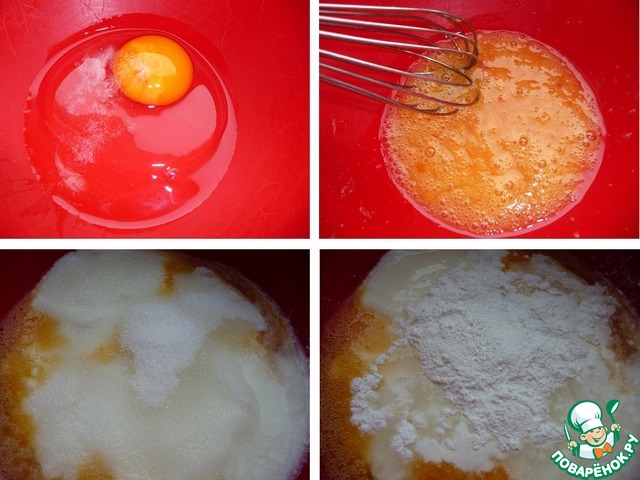 Яйцо взбить со щепоткой соли. Влить кефир и йогурт, добавить ванильный сахар, сахар и разрыхлитель теста.