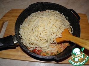 В готовый соус выкладываем отваренные макароны и перемешиваем.