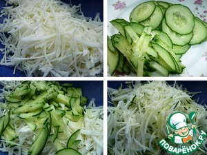 Нашинковать капусту, немного посолить и слегка перетереть. Огурцы нарезать тонкой соломкой, перемешать с капустой.