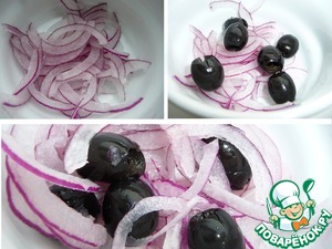 Оливки и лук добавить в салат, перемешать. -