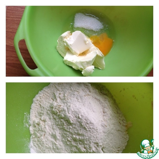1 яйцо взбить венчиком с 1 ст л сахара и мягким сливочным маслом ( комнатной температуры). Добавить ванилин, разрыхлитель и муку. Вымесить эластичное, мягкое тесто.