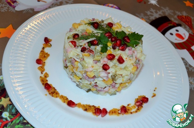 Отличный салат, очень яркий и нарядный, вкусно и празднично. Только у меня не курица, а ветчина и салями. Спасибо огромное за рецепт, Елена. С Праздниками !