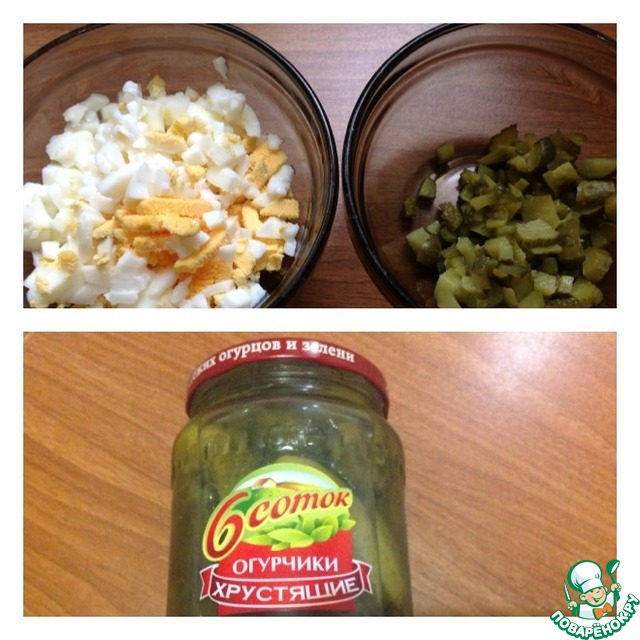 Яйца очистить и нарезать небольшим кубиком как и огурцы.