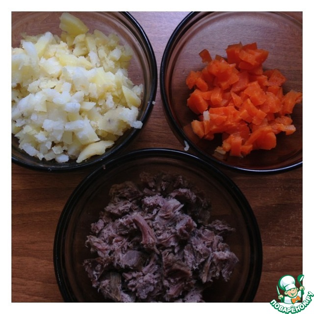 Отварные картофель и морковь очистить, нарезать маленьким кубиком. Отварную говядину разобрать на волокна или нарезать маленьким кубиком.