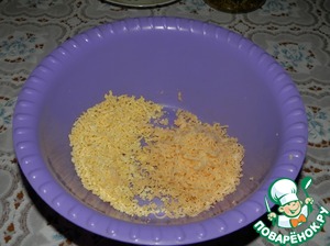 В эту же посуду натереть на мелкой тёрке 40 грамм твёрдого сыра и перемешать. Отставить на время в сторонку. Разогреть духовку до 180 градусов.