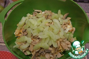 Черешки сельдерея очистить от прожилок и нарезать наискосок тонкими ломтиками. Добавить в салат.