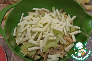 Последний ингредиент - сулугуни, нарезанный тонкими брусочками.