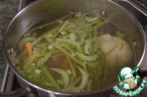 Поставить вариться овощной бульон из 2-х литров воды. На всякий случай, вдруг суп будет получаться слишком густым на ваш взгляд.
