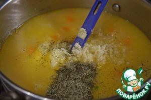 Постепенно и аккуратно влить оставшийся бульон, добавить тимьян, картофель и довести до кипения, посолить. Готовить на слабом огне в течение приблизительно 10 минут или пока картофель не станет нежным.