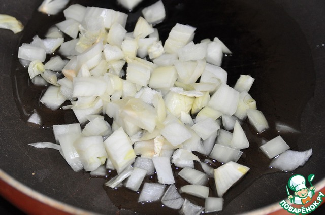 Лук режем мелкими кубиками и обжариваем на растительном масле на сковороде на среднем огне пару минут до прозрачности.
