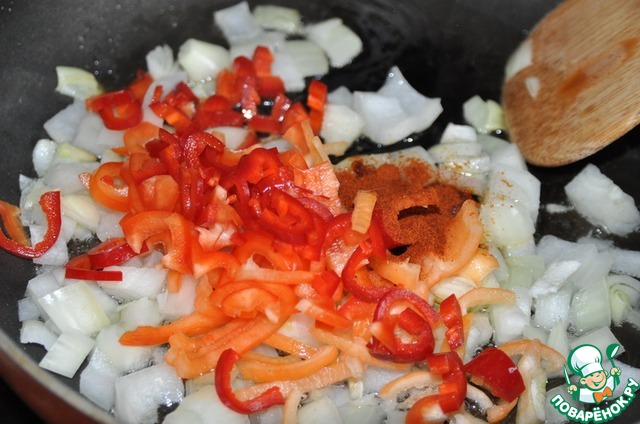 Добавляем тонко нарезанный болгарский перец, красный жгучий перец и паприку, перемешиваем, тушим все вместе 5 минут на среднем огне.