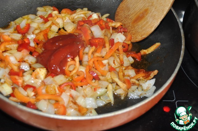 Кладём томатный соус или кетчуп, перемешиваем, тушим 1 минуту.