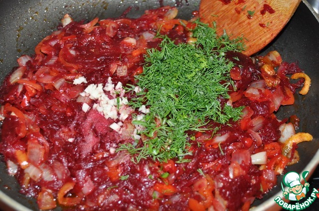 Берём свеклу вареную или печёную, чистим, натираем на средней тёрке, кладём на сковороду к овощам. Перемешиваем, тушим 2 минуты.