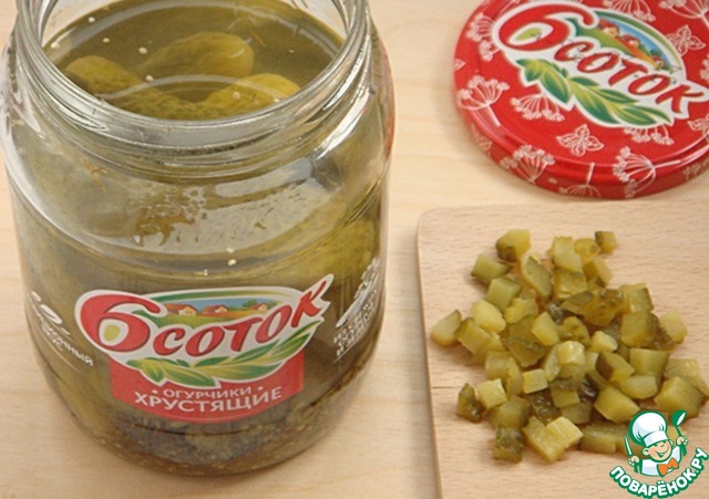 Берём маринованные огурцы. У меня "Огурчики хрустящие" ТМ 6 соток.