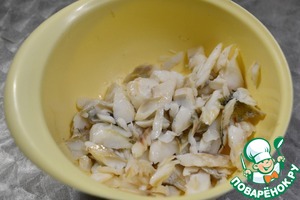 Отваренное рыбное филе режем или разбираем руками на кусочки.