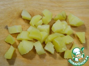 Картофель отвариваем, остужаем и нарезаем мелким кубиком.
