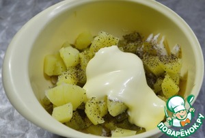 Складываем всё в миску, солим, перчим, добавляем майонез. Перемешиваем.