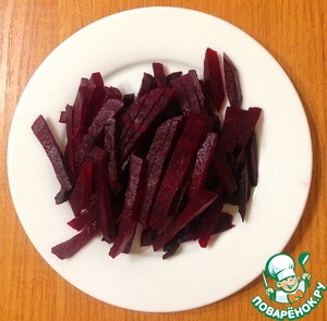 Вареную или запеченую свеклу нарезать так же соломкой.