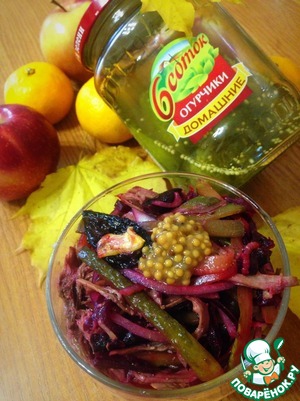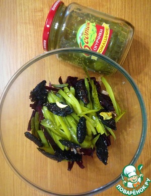 Следом за луком выкладываем мясо, свеклу, огурцы и вяленую сливу или чернослив. Сливу я готовила сама по этому замечательному рецепту: http://www.povarenok .ru/recipes/show/131 602/. Поливаем немного маслом от сливы или любым другим и перемешиваем.