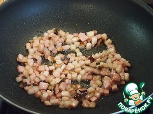 • На сковороде растопить жир и слегка обжарить на нем бекон, вытапливать его не нужно.