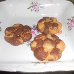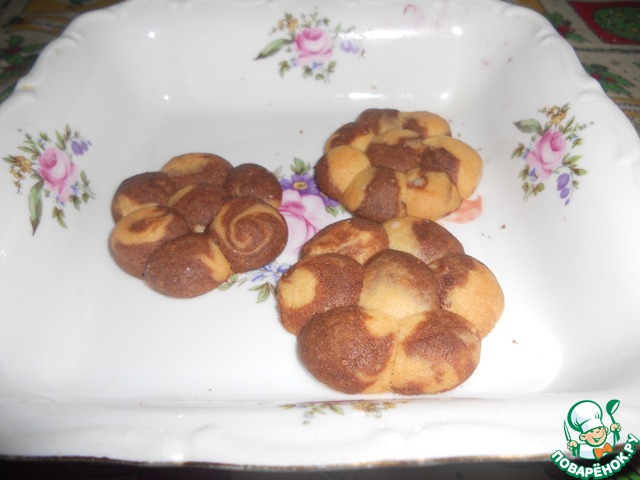 [+4]По процессу: Тесто делила на 3 части, в одну добавляла каплю желтого красителя. Скатывала не шарики, а длинные колбаски и укладывала их в нужном порядке на коричневое тесто. Потом готовую "колбасу" нарезала на ломтики.