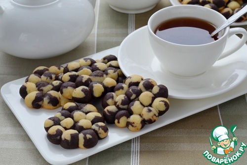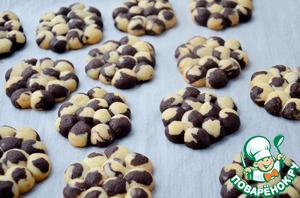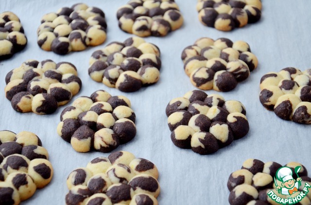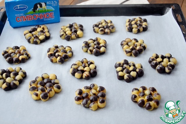Достать тесто из холодильника. Сформовать печенье: для этого отщипывать белое и коричневое тесто и скатывать шарики примерно в диаметре 0,8-10 мм. Укладывать эти шарики друг к другу на противень застеленный пекарской бумагой... У меня вышло 15 печений. На формовку такого печенье времени потребуется больше чем просто вырезать формочкой фигурки. Можно раскатать тесто толщиной около 0,5-0,7 мм и вырезать любой формы печенье.