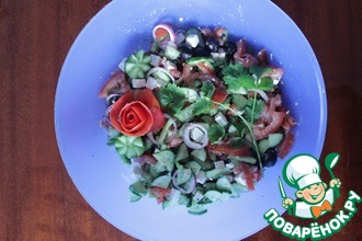 В миске соединить все ингредиенты, влить заправку и размешать.
