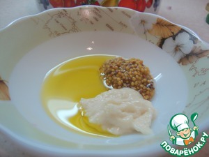 В чашке соединить зернистую горчицу, сливочный хрен и масло оливковое. Хорошо размешать до однородного состояния.