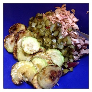 Огурчики порезать маленьким кубиком как и курочку. Добавить специи и остывшие жареные кабачки.