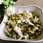 У меня молодой цуккини, поэтому от кожицы я его не чистила. Нарезать цуккини колечками и обжарить до готовности в растительном масле. Тем временем с горошка слить лишнюю жидкость и выложить горошек в салатник. Добавить мелко нарезанный стручковой острый перец и лук нашинкованный полу кольцами.