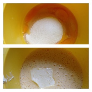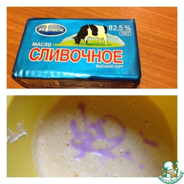 Яйца взбить с сахаром и ванилином в пену. Добавить мягкое сливочное масло ( комнатной температуры). Взбить до полного растворения масла.