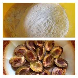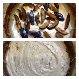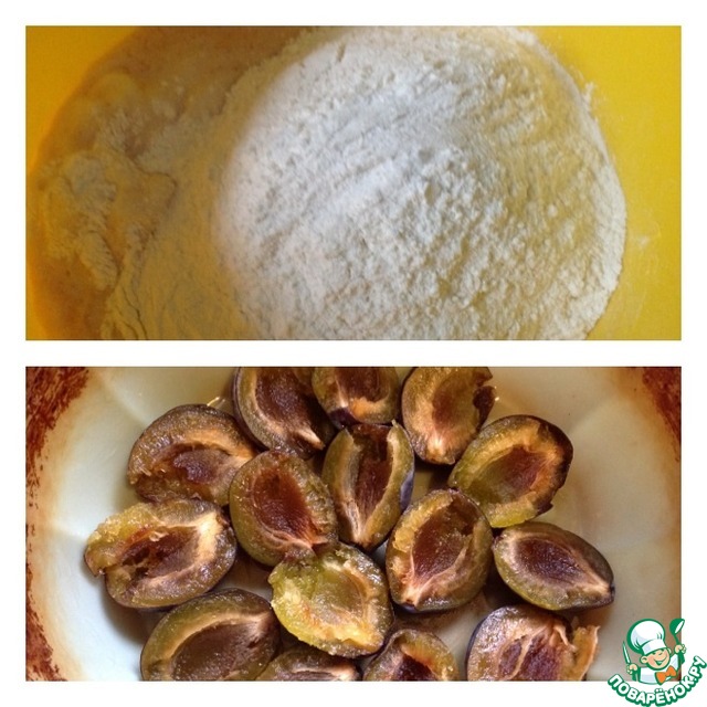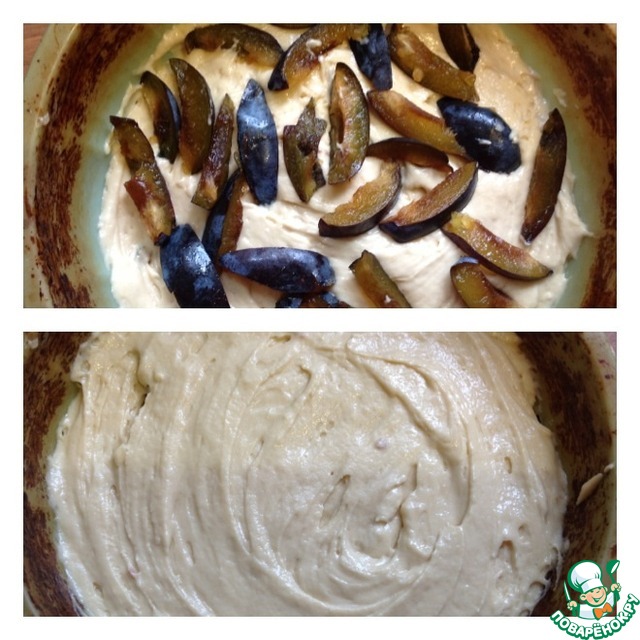Всыпать муку и разрыхлитель, взбить тесто до однородного состояния. На дно формы для выпечки выложить половинки слив срезом вверх ( косточки предварительно удалить).