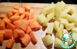 Картофель и морковь режу кубиками приблизительно 1 см.