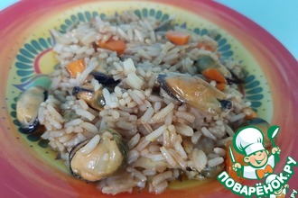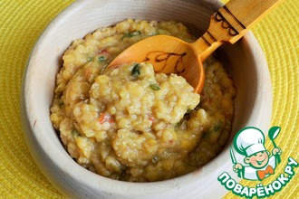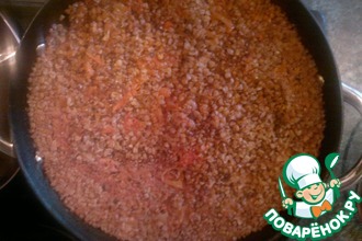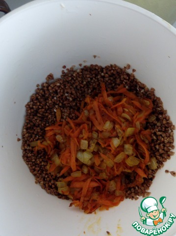 Гречку промываем, к ней выкладываем пассированные овощи. Все тшательно перемешиваем.