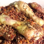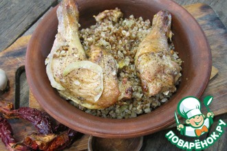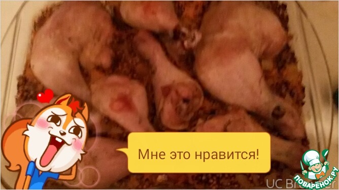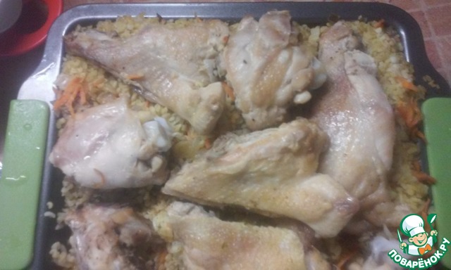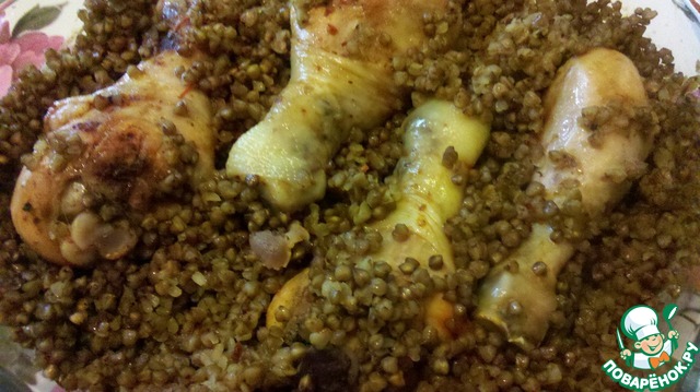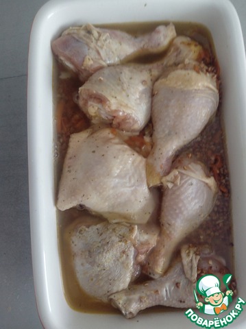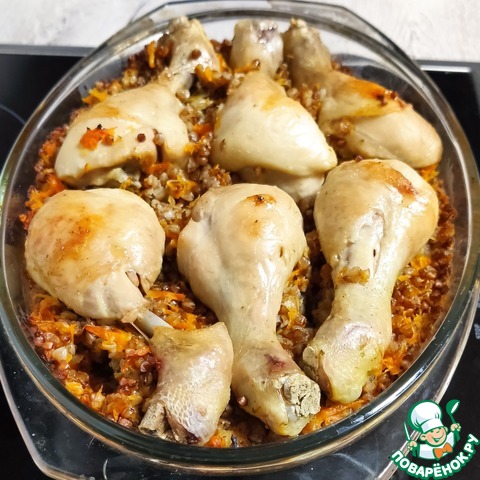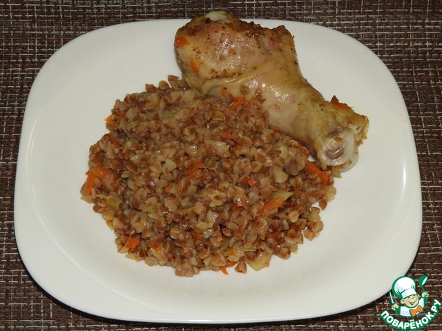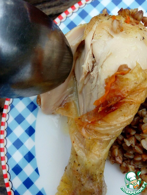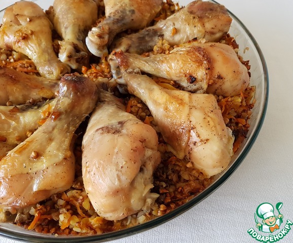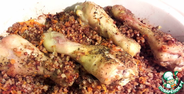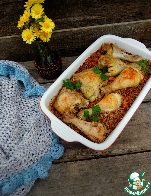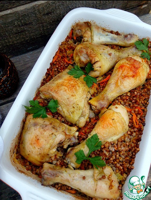 Если есть крышка, то закрываем ее форму. Если же крышка не предусмотрена, то закрываем форму фольгой. Запекаем при 180° в духовке около 1 часа. За это время гречка идеально приготовится, а мясо будет легко отделяться от кости. За 5 минут до готовности можете убрать фольгу для того, чтобы курица подрумянилась.