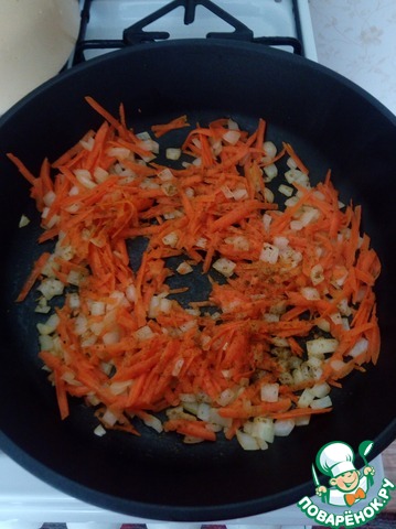 Лук чистим, режем кубиком. Морковь чистим, трем на крупной терке. Пассируем до мягкости на растительном масле.